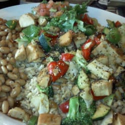Your choice of chicken, fish or tofu over rice and beans.